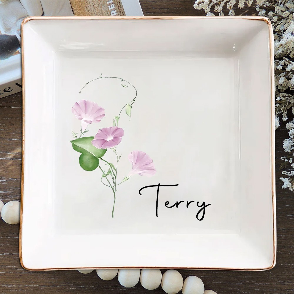 Personalised Birth Flower Jewelry Dish with Name Birthday Gift for Her Wedding Bridesmaid Gift Christmas Gifts for Mum Friend