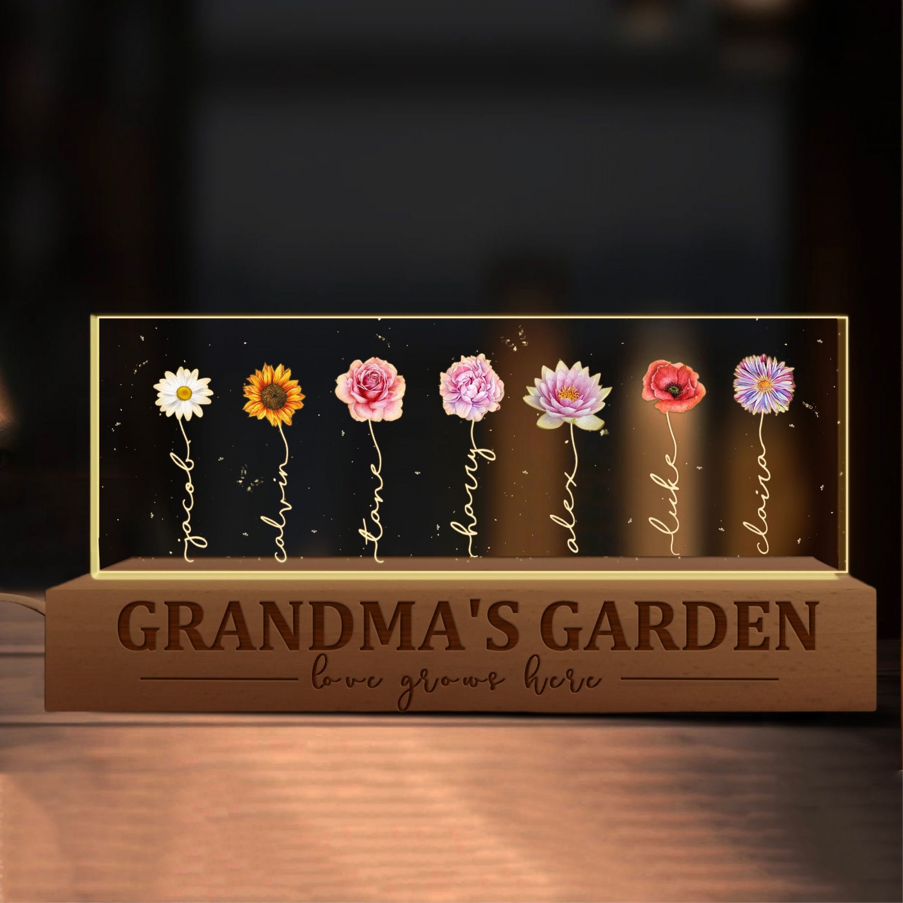 Personalised Mum's Garden Love Grows Here Birth Flower Wood Night Light Keepsake Gifts for Mum Grandma Christmas Gift