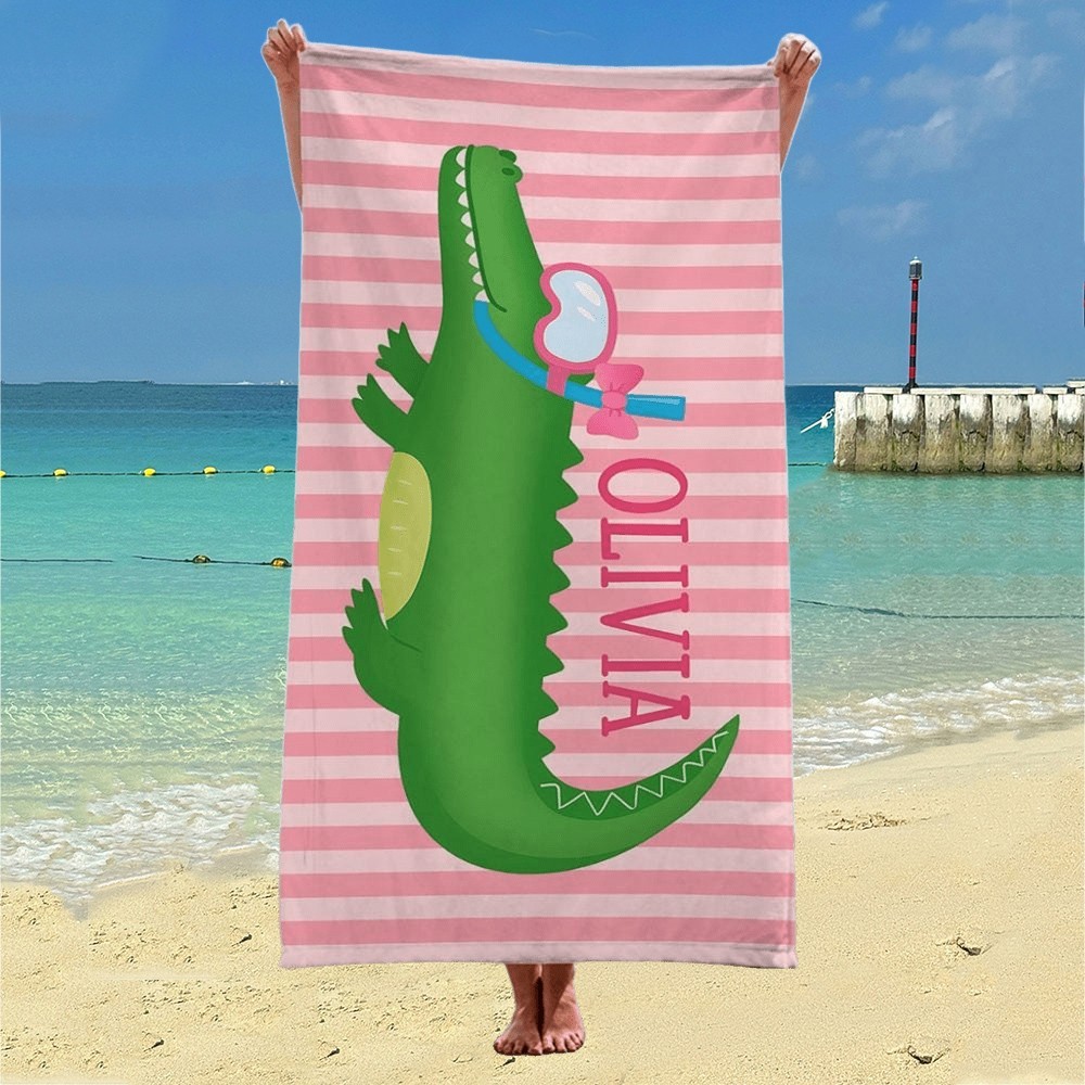 Custom Cartoon Alligator Pink Striped Beach Towel with Name for Kids Summer Beach Gift for Girls Boys