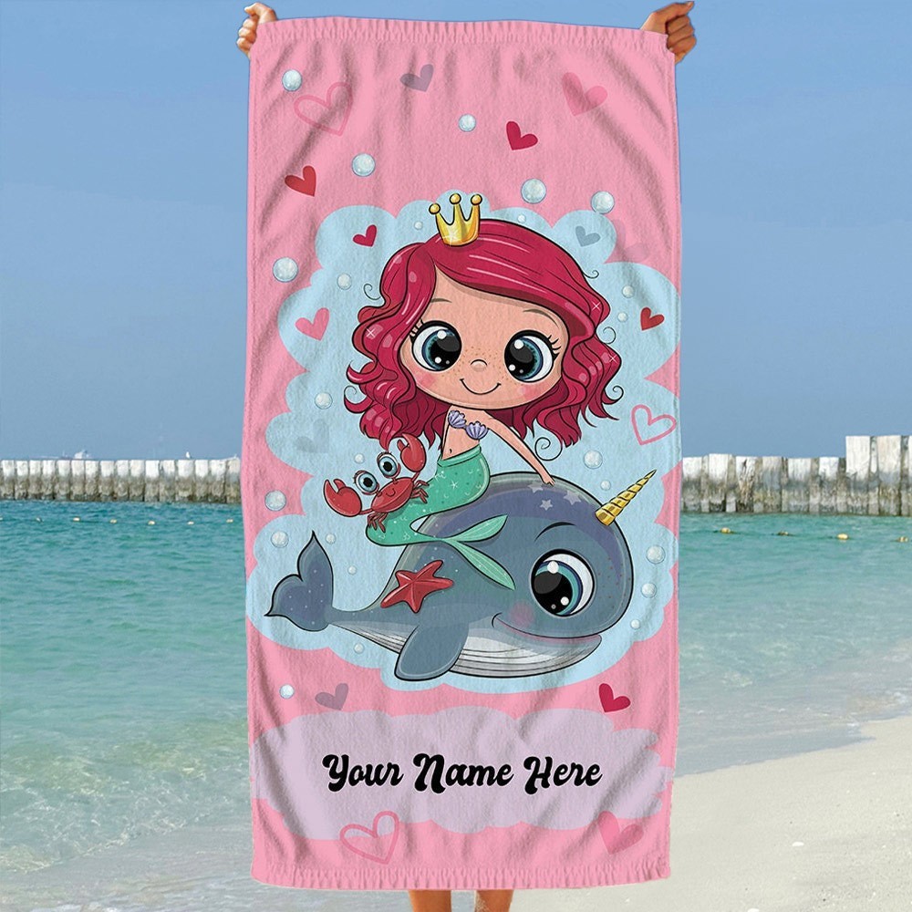 Custom Cartoon Mermaid Beach Towel with Name Personalised Beach Towel for Kids Summer Gift for Girls