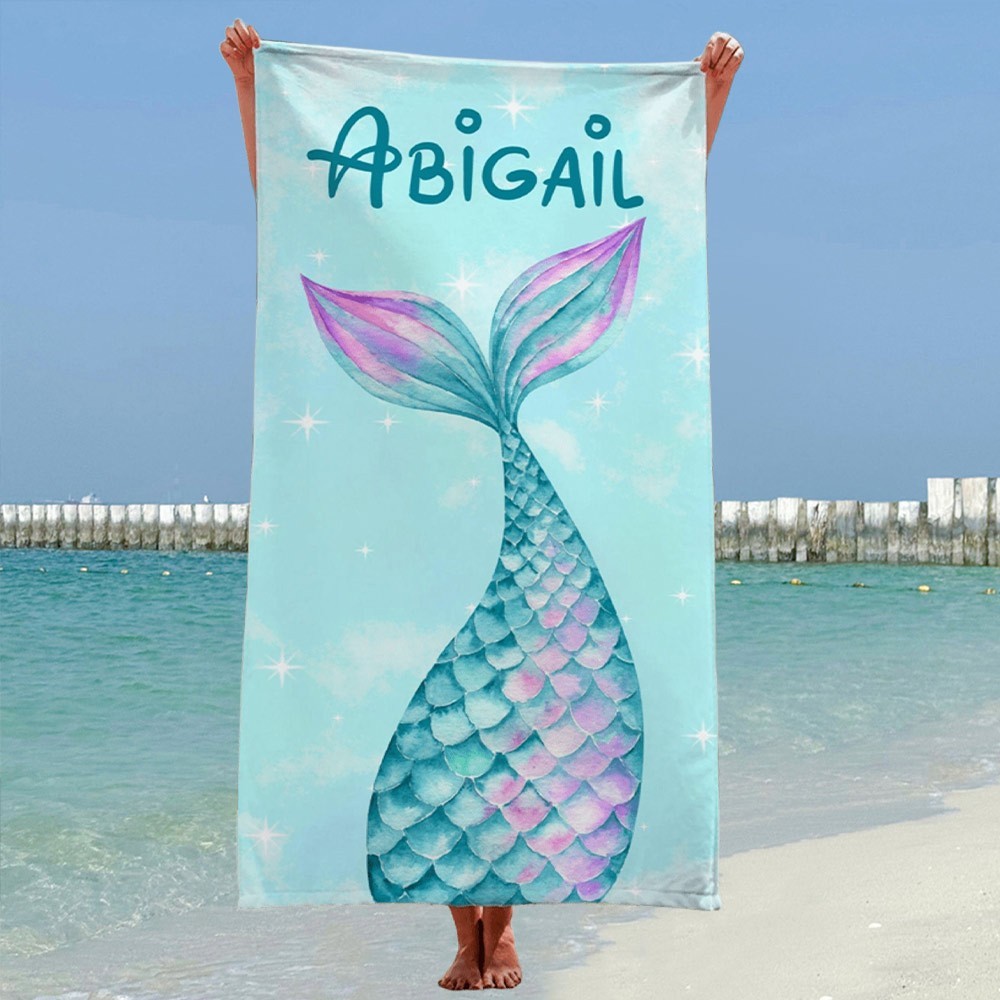 Custom Cartoon Mermaid Tail Beach Towel with Name Summer Vacation Gift for Girls Birthday Gift for Kids