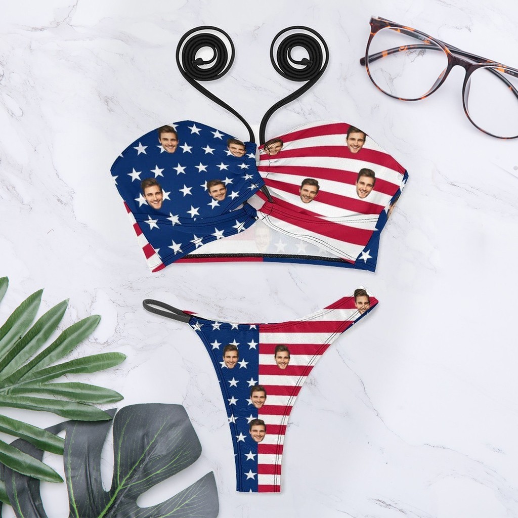 Custom Face Photo Pattern American Flag Swimsuit Self Tie Halter Neck Straps Cross Strap Bikini Summer Gift For Her