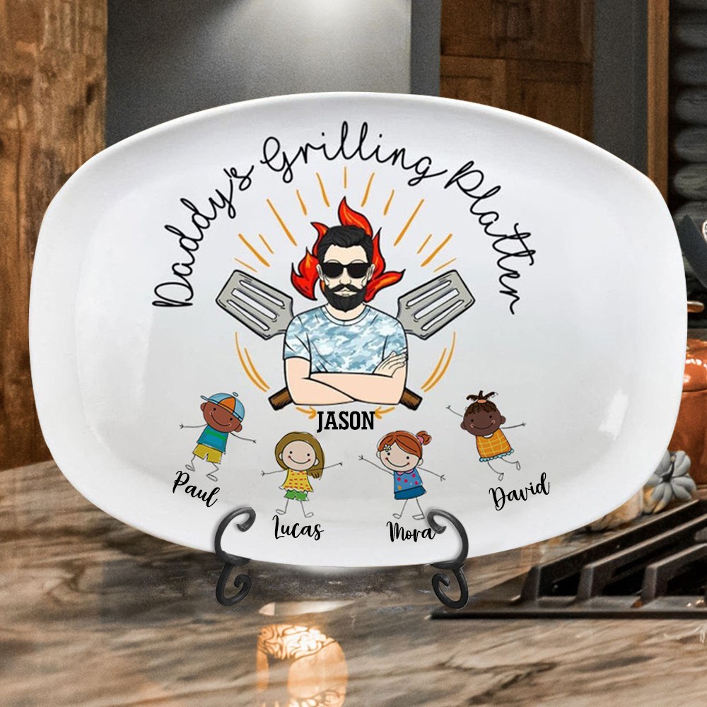 Custom Funny Daddy's Grilling Plate with Kids Name For Father's Day Gift