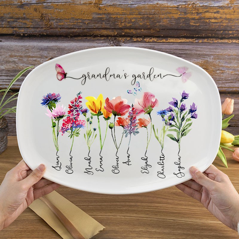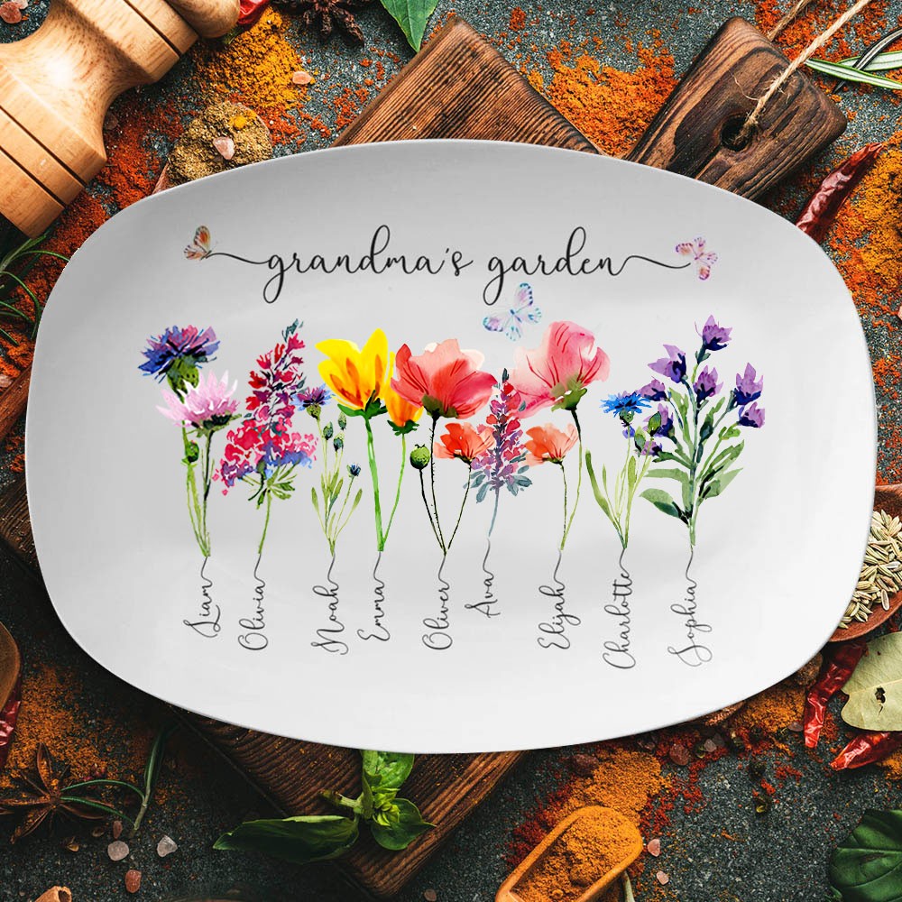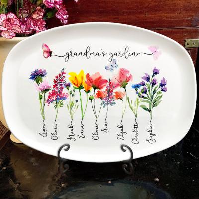 Custom Grandma's Garden Birth Flower Platter With Grandkids Names Unique Gift for Grandma Mum