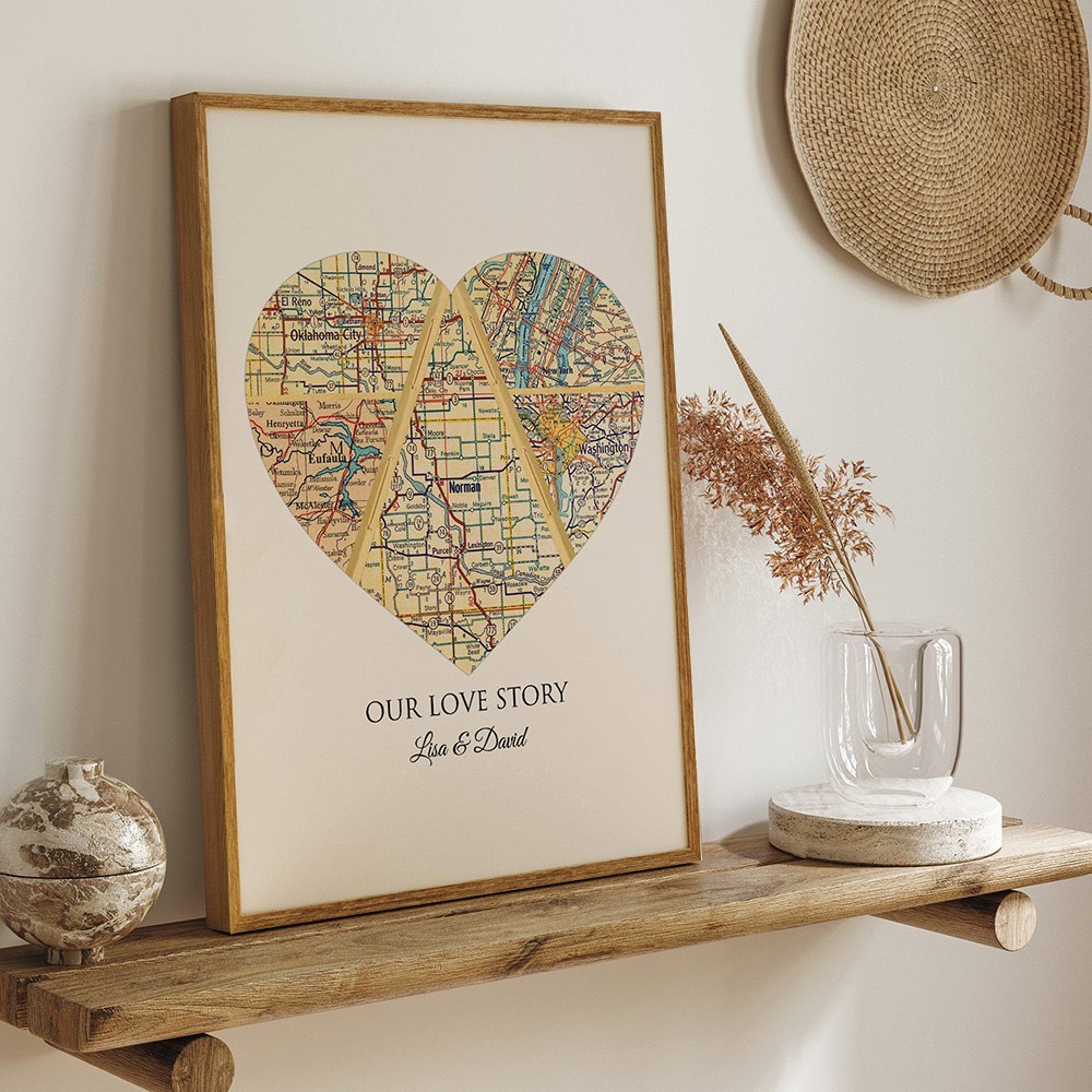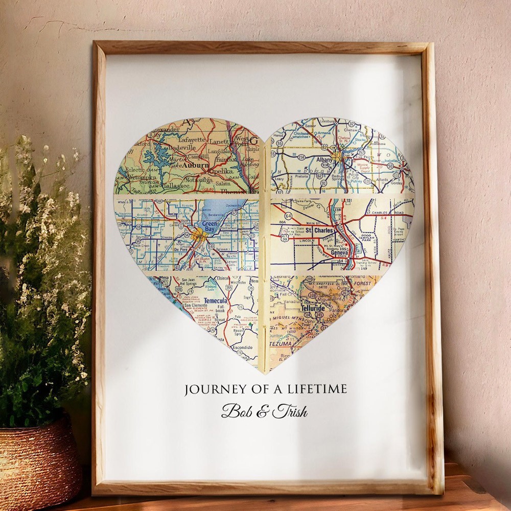 Custom Heart Shaped Adventure Map Print Frame for Couples Unique Wedding Anniversary Gifts for Husband Wife