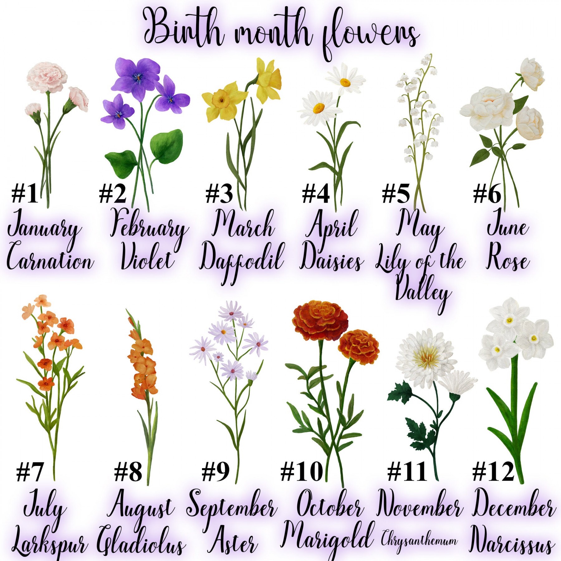 -- Select 8th Flower Type -- January-Carnation February-Violet March-Daffodil April-Daisies May-Lily of the Valley June-Rose July-Larkspur August-Gladiolus September-Aster October-Marigold November-Chrysanthemum December-Narcissus