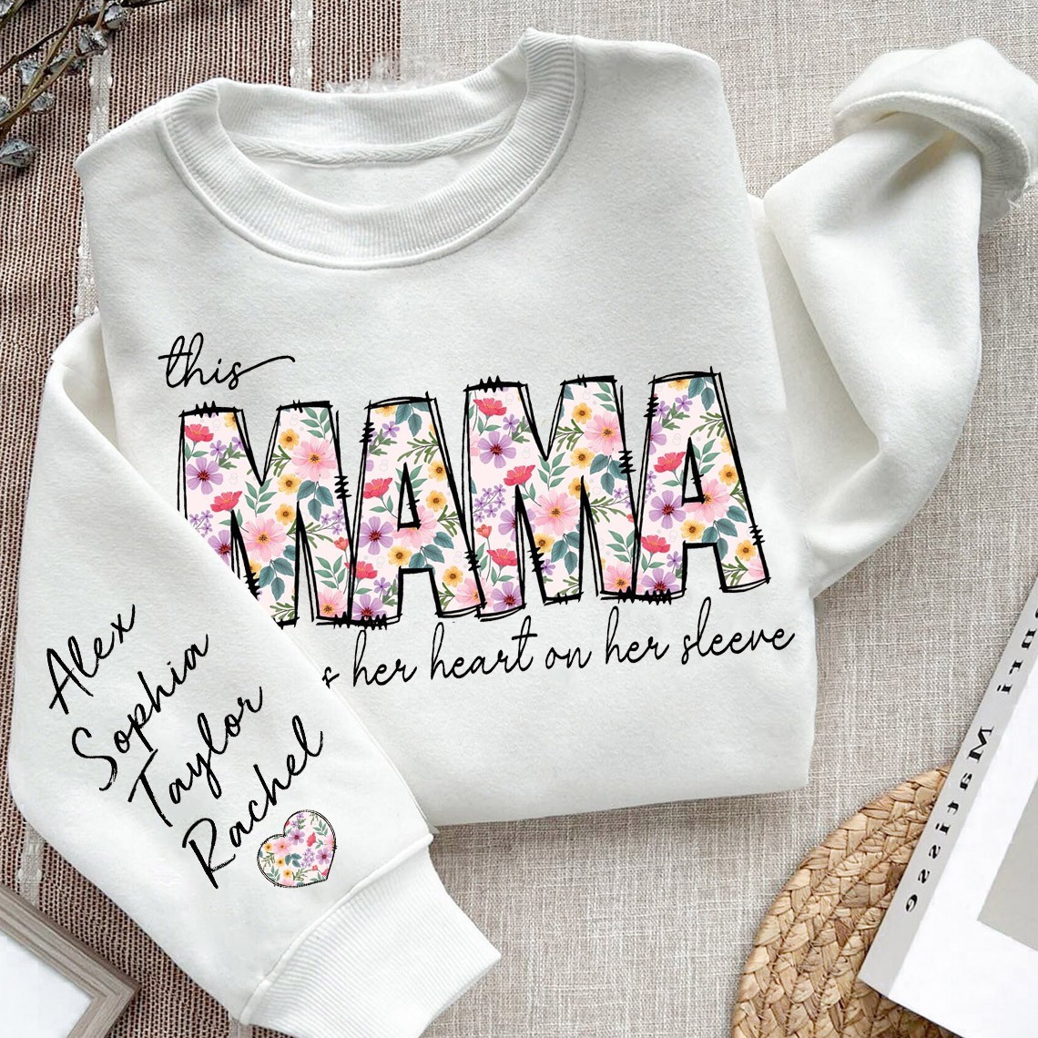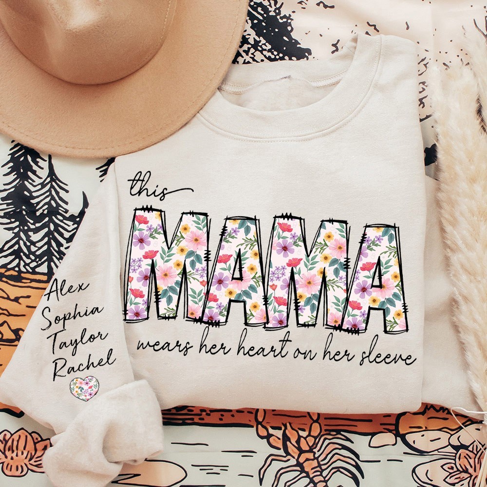 Custom This Mama Wears Her Heart on Her Sleeve Sweatshirt with Kids Names on Sleeve Gifts for Mum Mother's Day Gift Ideas