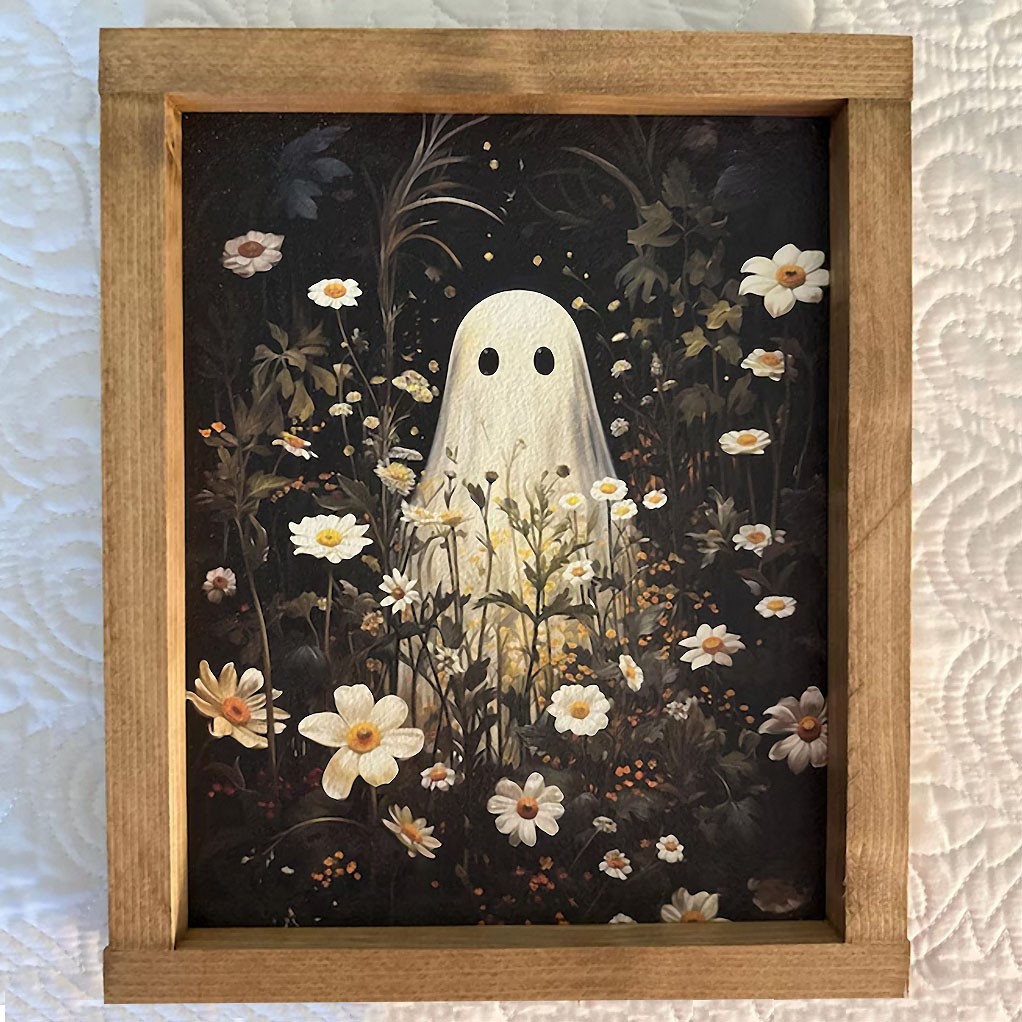 Halloween Ghost In Flower Field Print Wood Sign Unique Halloween Gifts