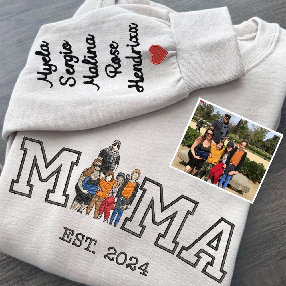 Mama Embroidered Photo Portrait Sweatshirt with Kids Names on Sleeve Custom Gifts for Mum Mother's Day Gift Ideas