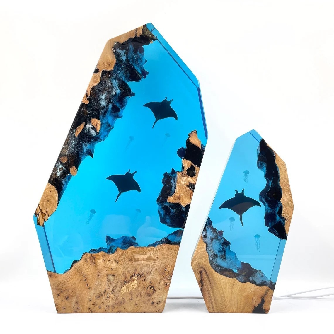 Manta Rays And Jellyfish Resin Wood Lamp Blue Ocean Miniature Birthday Gift Christmas Gift Ideas