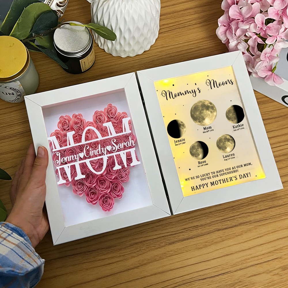 Name Flower Shadow Box with Moon Phase Night Light By Date Personalised Gifts for Grandma Mum Mother's Day Gift Ideas