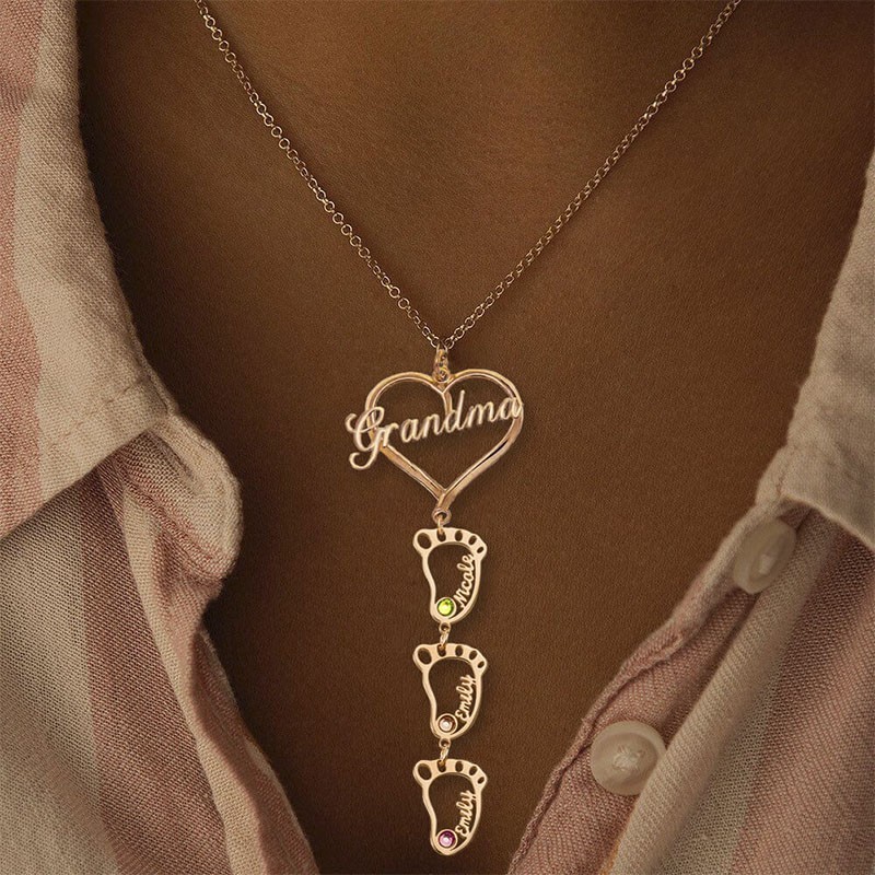 Personalised 1-10 Baby Feet Pendants Grandma Necklace With Names And Birthstones Birthday Gift For Grandma