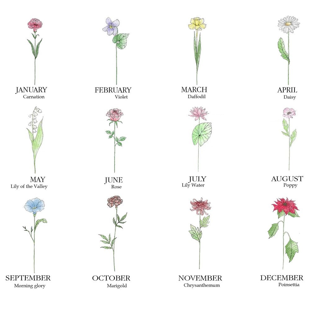 -- Select 8th Flower Type -- January-Carnation February-Violet March-Daffodil April-Daisy May-Lily of the Valley June-Rose July-Lily Water August-Poppy September-Morning Glory October-Marigold November-Chrysanthemum December-Poinsettia Sweet Pea Iris Snowdrop Gladioli Honeysuckle Cosmos