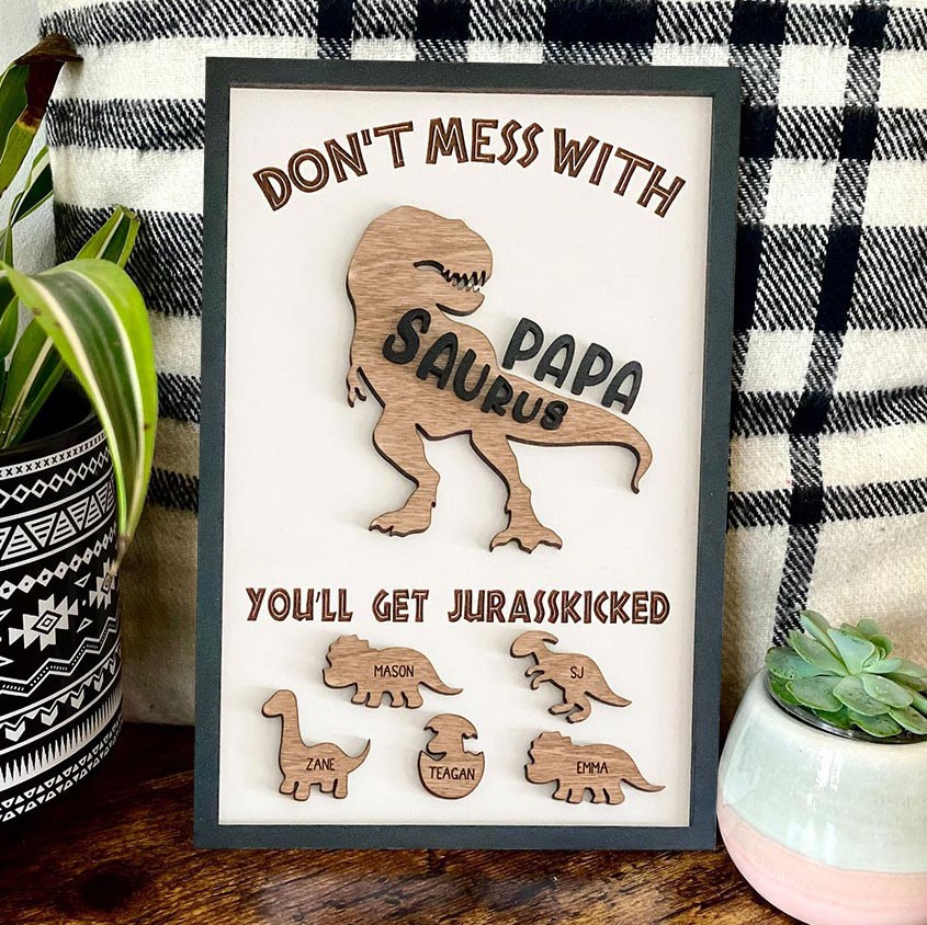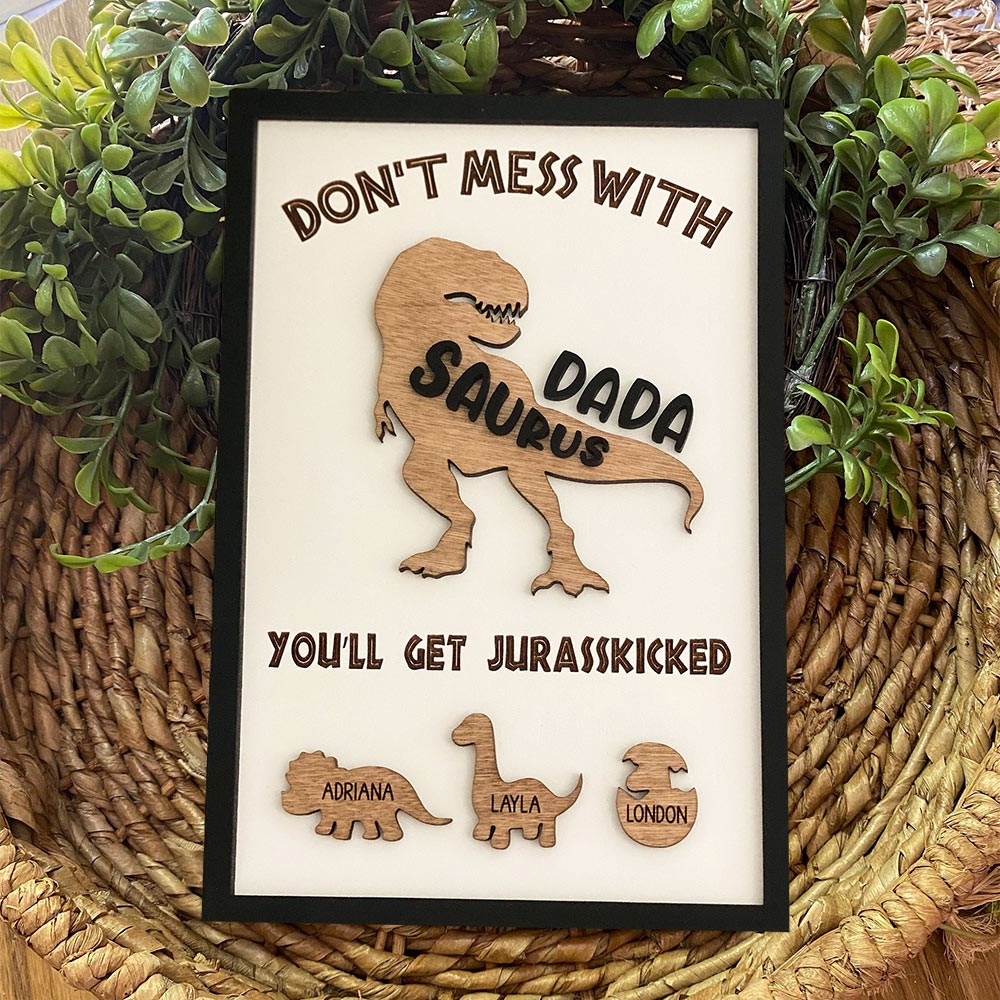 Personalised Dada Dinosaur Wooden Frame Sign With Kids Names Special Father's Day Gift Ideas