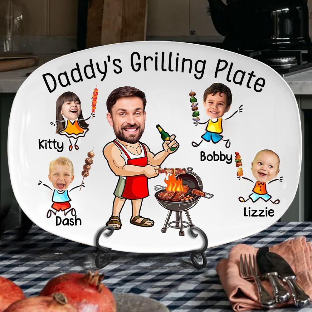 Personalised Daddy's Grilling Plate With Kids Portrait and Names Custom Family BBQ Plate Unique Kitchen Gifts for Dad Father's Day Gifts
