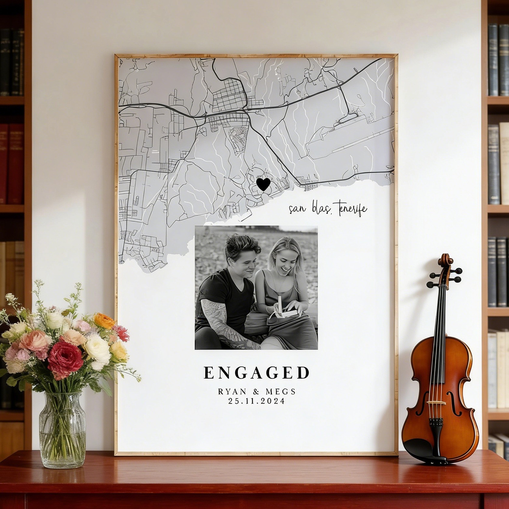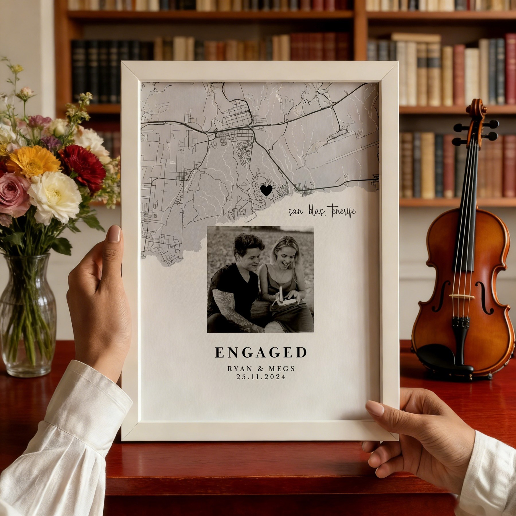 Personalised Engagement Location Map Print Frame with Photo Couple Engagement Gifts Valentine's Day Gift