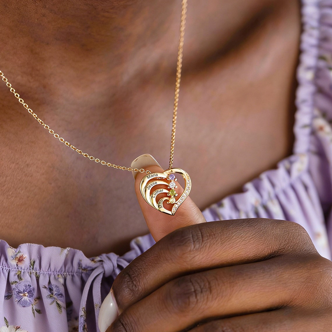 Personalised Engraved Name Necklace with Birthstone – Family Jewelry Gift, Heart Necklace, Perfect Birthday or Mother's Day Gift