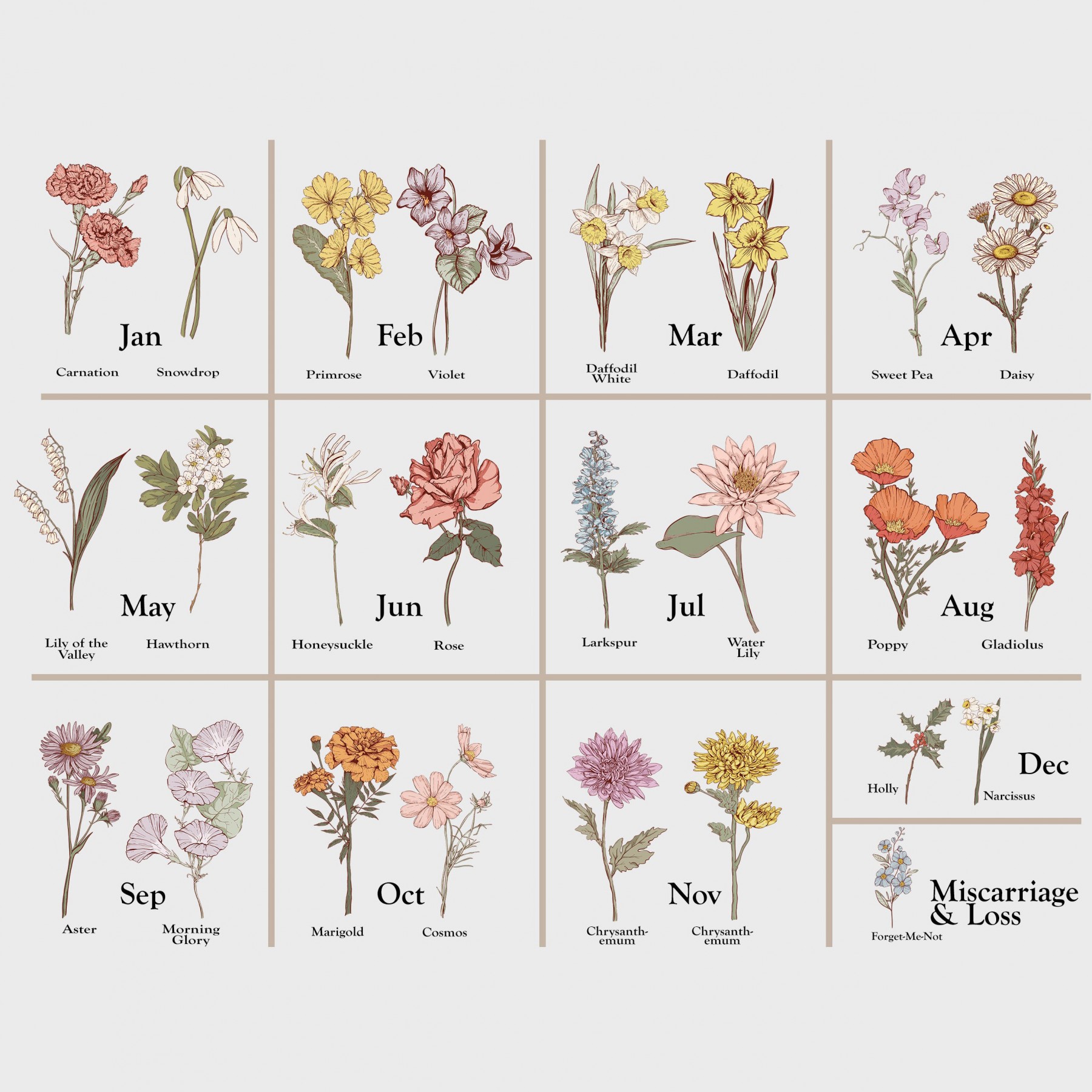 -- Select 6th Flower Type -- January-Carnation January-Snowdrop February-Primrose February-Violet March-Daffodil March-Jonquil April-Sweet Pea April-Daisy May-Hawthorn May-Lily of the Valley June-Honeysuckle June-Rose July-Water Lily July-Delphinium August-Poppy August-Gladiolus September-Morning Glory September-Aster October-Cosmos October-Marigold November-Pink Chrysanthemum November-Yellow Chrysanthemum December-Holly December-Narcissus Miscarriage & Loss