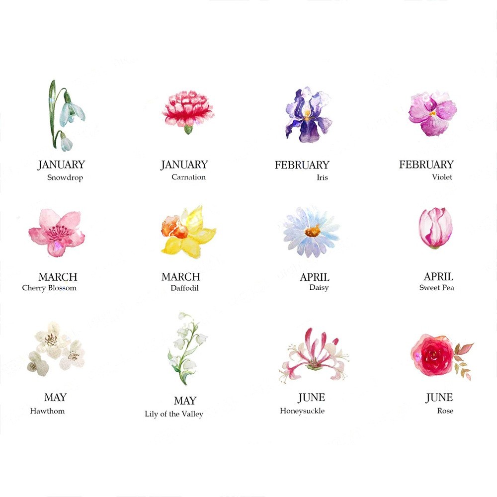 -- Select 6th Flower Type -- January-Carnation January-Snowdrop February-Iris February-Violet March-Daffodil March-Cherry Blossom April-Sweet Pea April-Daisy May-Hawthorn May-Lily of the Valley June-Honeysuckle June-Rose July-Lily Water July-Larkspur August-Poppy August-Gladiolus September-Morning Glory September-Aster October-Cosmos October-Marigold November-Chrysanthemum November-Peony December-Poinsettia December-Holly Berry