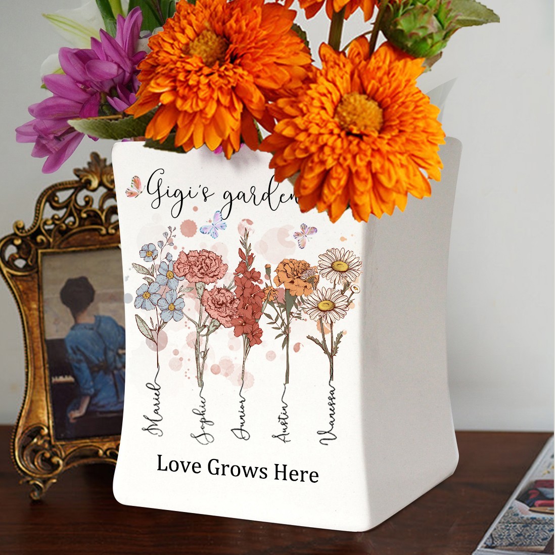 Personalised Grandma's Garden Love Grows Here Birth Flower Vase with Grandkids Names Gifts for Grandma Mum Mother's Day Gift