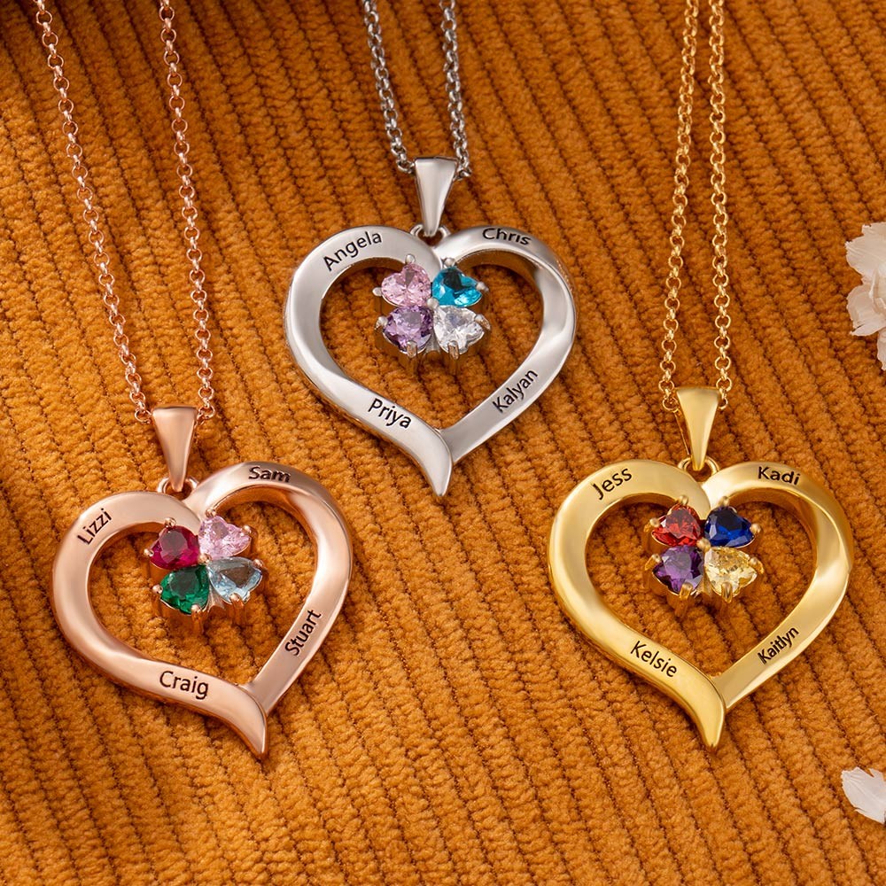 Personalised Heart Shaped Birthstones Necklace With Engraved Names Family Keepsake Gifts for Mum Grandma