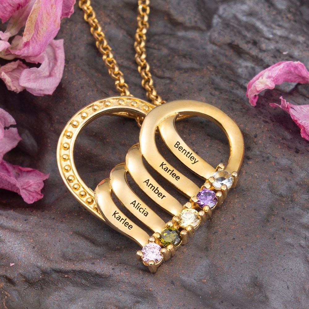 Personalised Heart Shaped Family Names Necklace With Birthstones Unique Gift For Mum Grandma