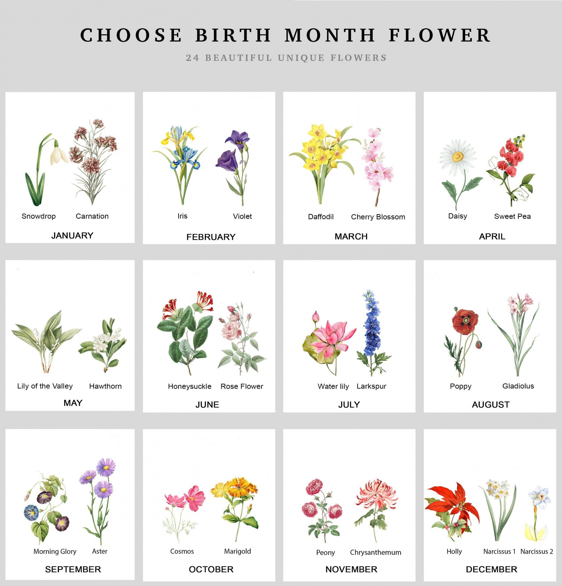 -- Select 3rd Flower Type -- January-Carnation January-Snowdrop February-Iris February-Violet March-Cherry Blossom March-Daffodil April-Sweet Pea April-Daisy May-Lily of the Valley May-Hawthorn June-Honeysuckle June-Rose Flower July-Larkspur July-Water Lily August-Poppy August-Gladiolus September-Aster September-Morning Glory October-Marigold October-Cosmos November-Chrysanthemum November-Peony December-Holly December-Narcissus 1 December-Narcissus 2