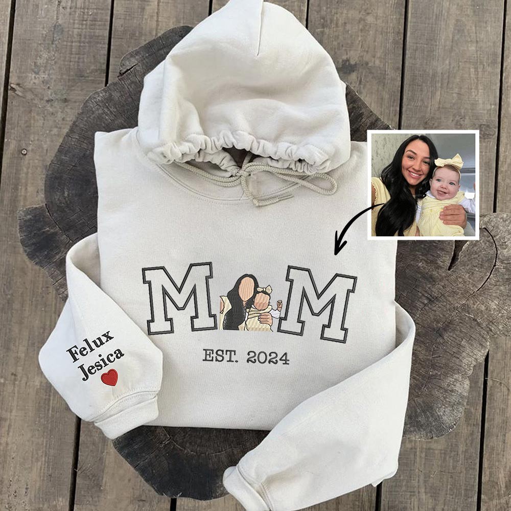 Personalised Mama Embroidered Photo Portrait Sweatshirt with Kids Names on Sleeve Birthday Gift for Mum Mother's Day Gift