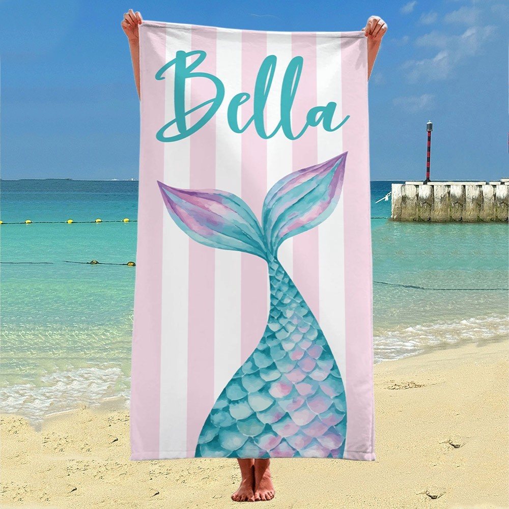 Personalised Mermaid Beach Towel with Name for Girls Summer Party Birthday Gift for Kids