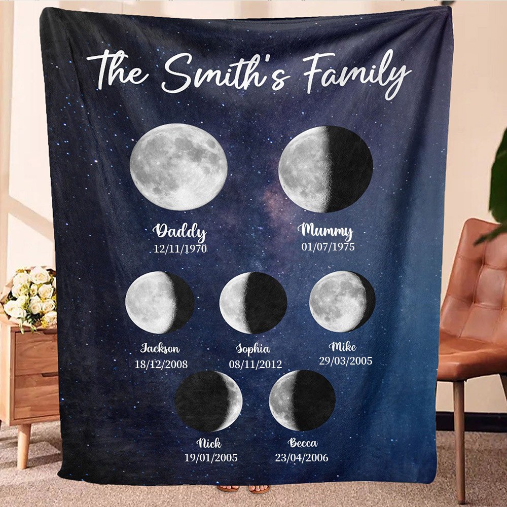 Personalised Moon Phase Family Blanket with Kids Names Family Keepsake Gifts