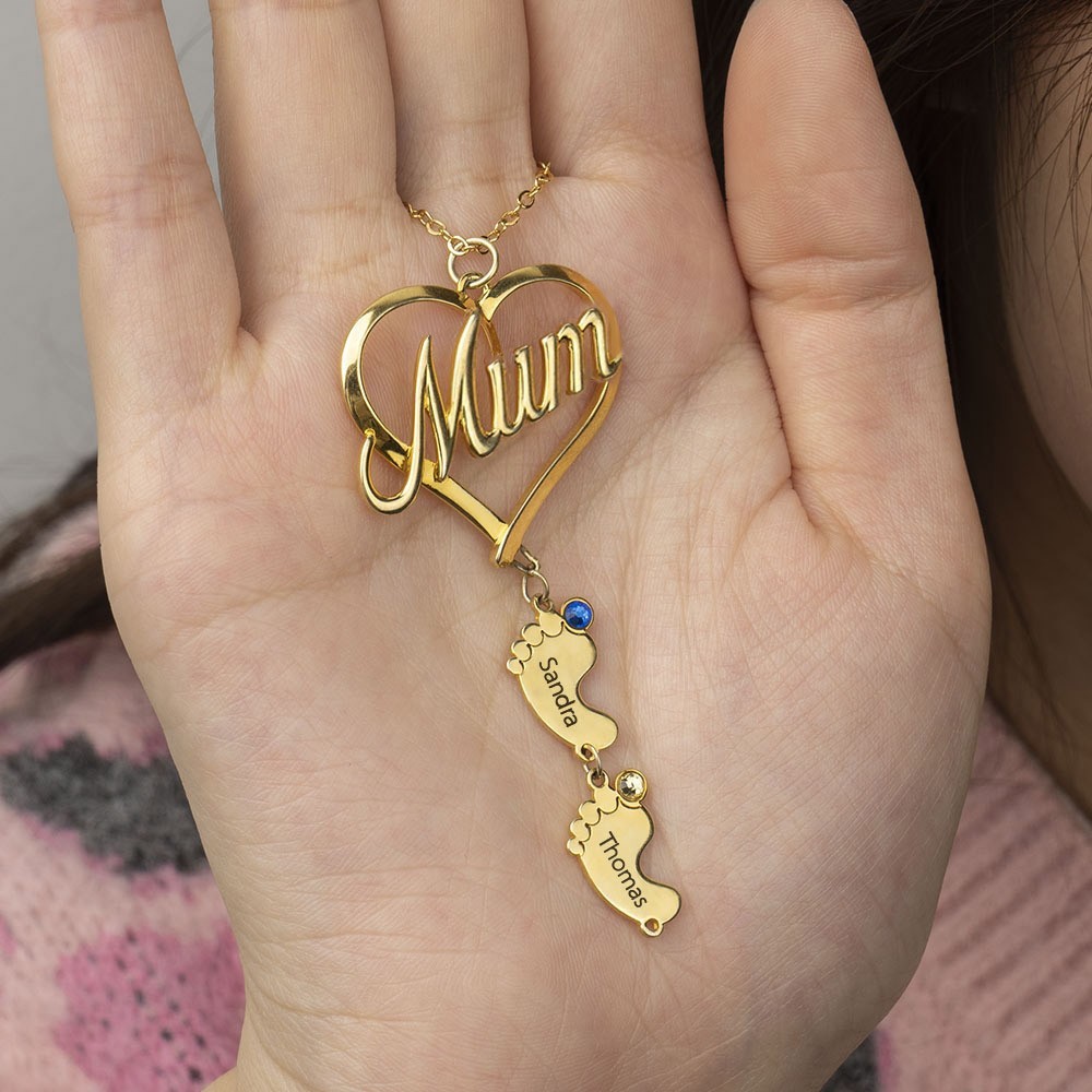 Personalised Mum Family Necklace 1-10 Names and Birthstones with Baby Feet Pendants Unique Gift For Mum Grandma Christmas Gift Ideas