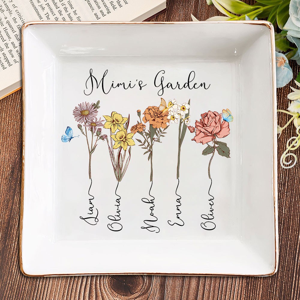 Personalised Mum's Garden Birth Flower Jewellery Dish with Kids Names Unique Christmas Gift for Mum Grandma