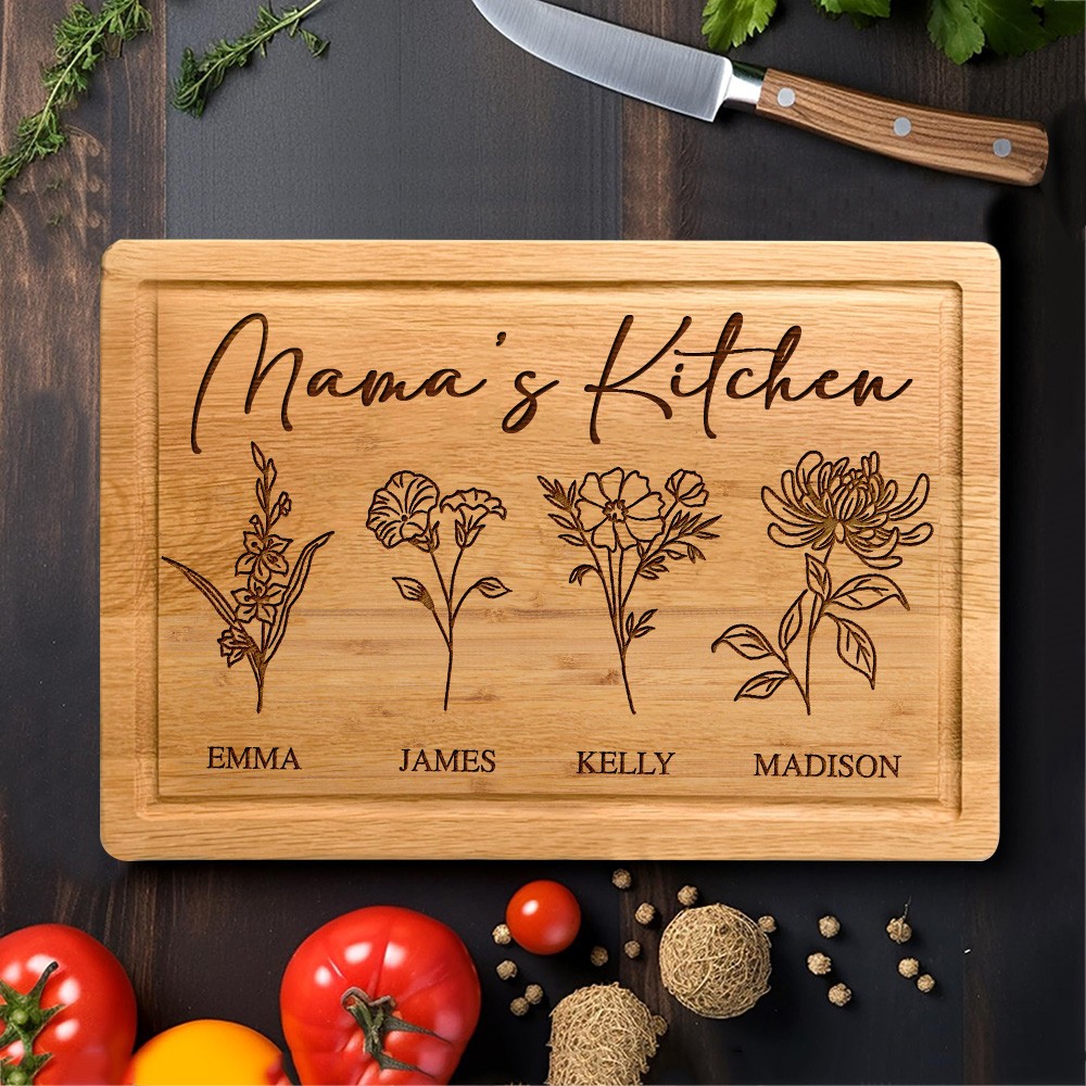 Personalised Mum's Kitchen Birth Flower Cutting Board with Engraved Names Family Gifts for Mum Grandma