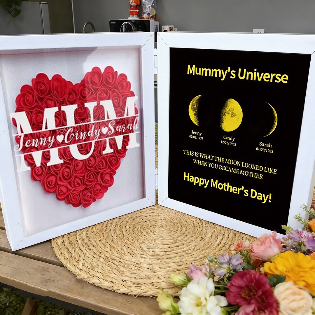 Personalised Name Flower Shadow Box with Mummy's Universe Moon Phase Frame Unique Gift for Mum Grandma Mother's Day Gifts