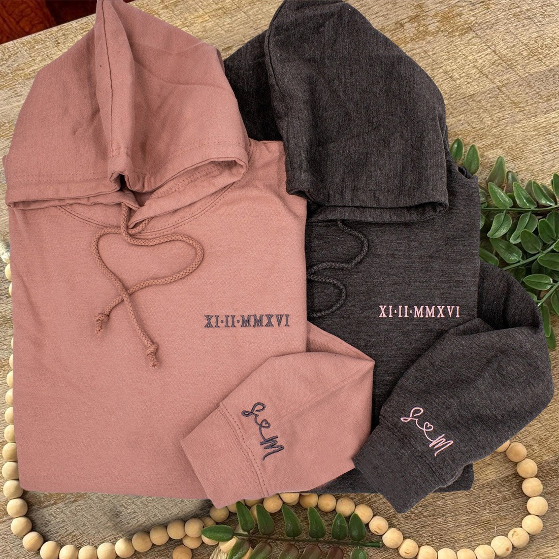 Roman Numeral Date Matching Custom Embroidered Couple Hoodie with Initial On Sleeve Gifts for Anniversary Valentine's Day
