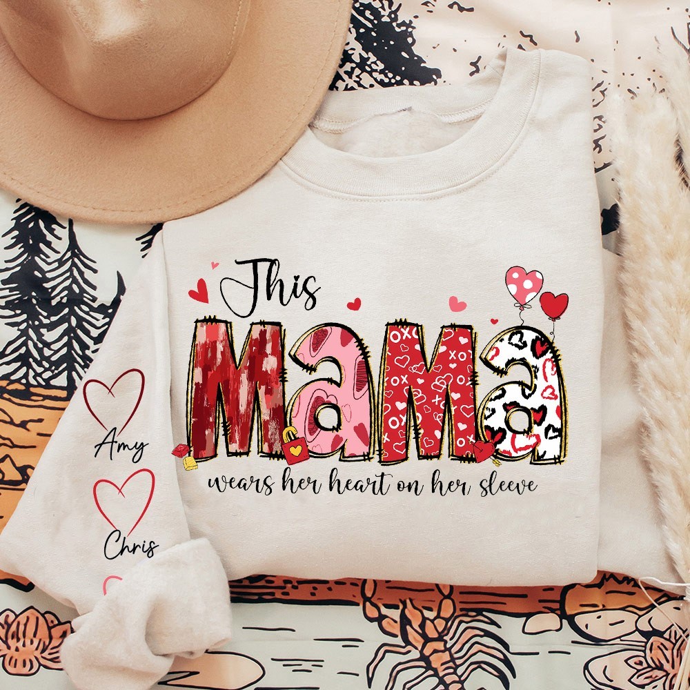 This Mama Wears Her Heart on Her Sleeve Sweatshirt with Kids Names on Sleeve Custom Gifts for Mum Mother's Day Gift Ideas