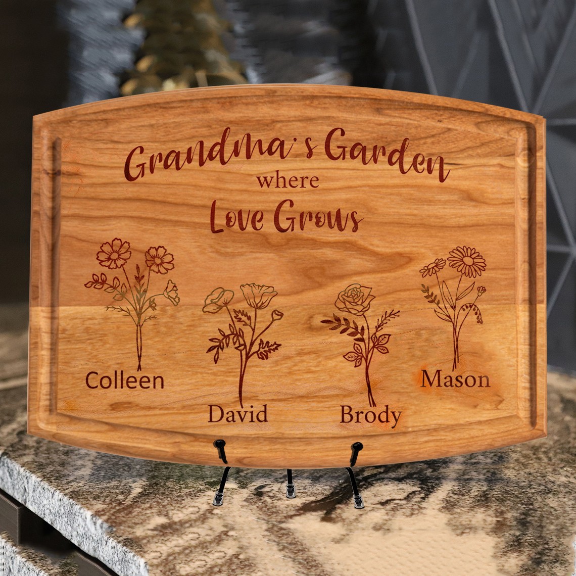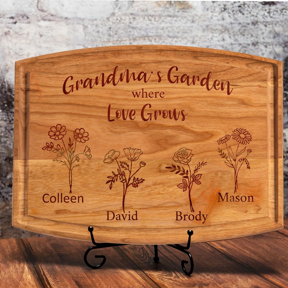 Custom Grandma's Garden Where Love Grows Birth Month Flower Cutting Board with Kids Names Gifts for Grandma Mom
