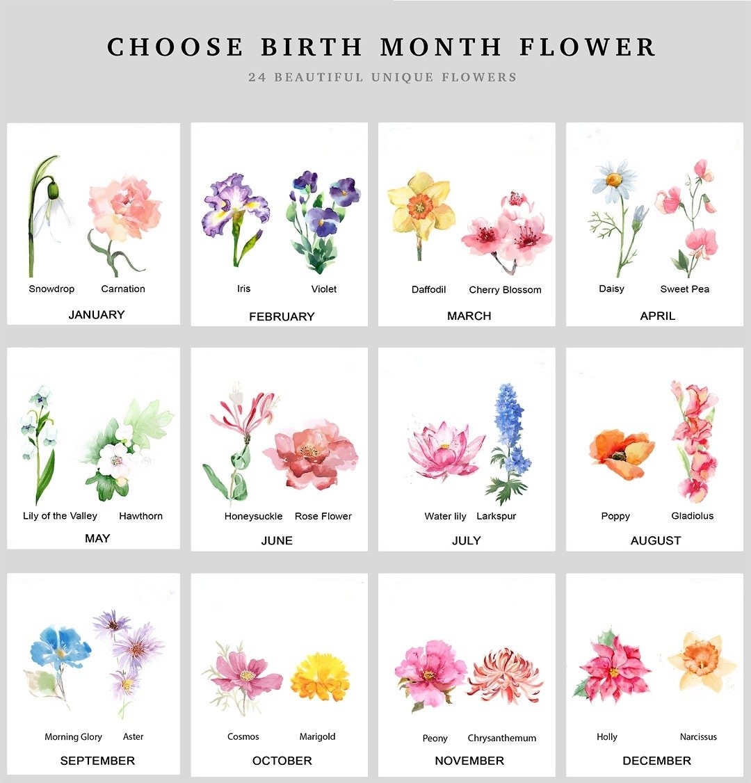 -- Select 12th Flower Type -- January-Carnation January-Snowdrop February-Iris February-Violet March-Cherry Blossom March-Daffodil April-Sweet Pea April-Daisy May-Lily of the Valley May-Hawthorn June-Honeysuckle June-Rose Flower July-Larkspur July-Water Lily August-Poppy August-Gladiolus September-Aster September-Morning Glory October-Marigold October-Cosmos November-Chrysanthemum November-Peony December-Holly December-Narcissus