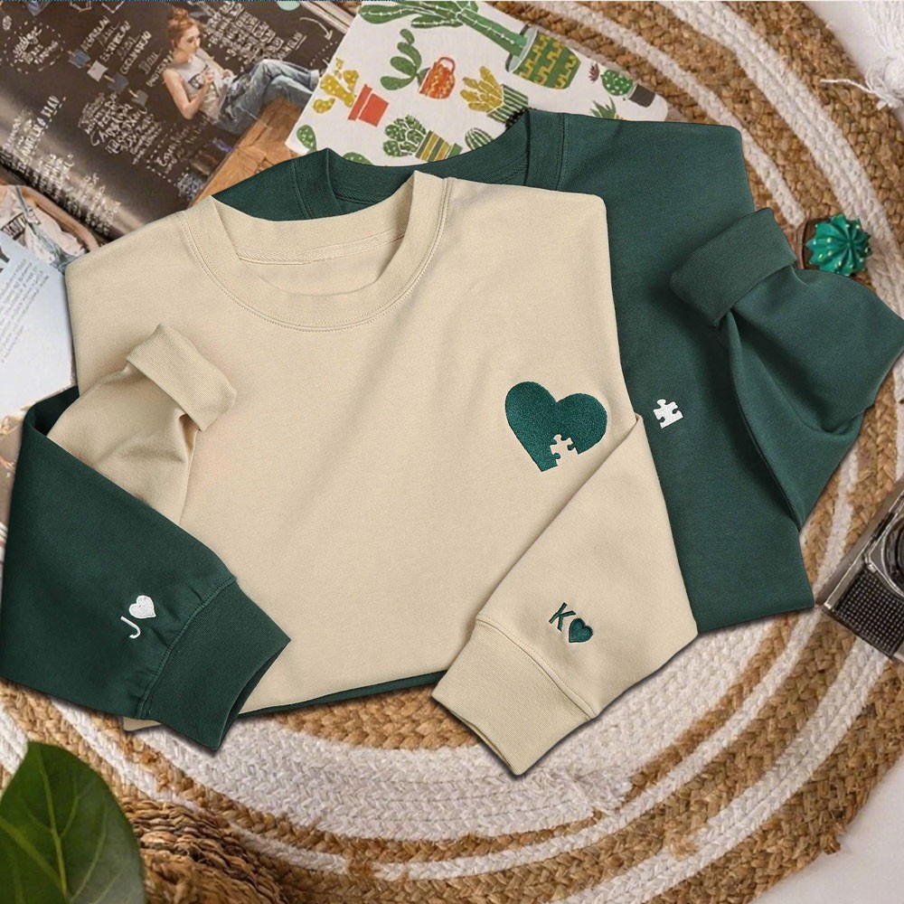 Custom Embroidered Heart and Puzzle Piece Couples Hoodie with Initial On Sleeve Anniversary Gift Valentine's Day Gifts
