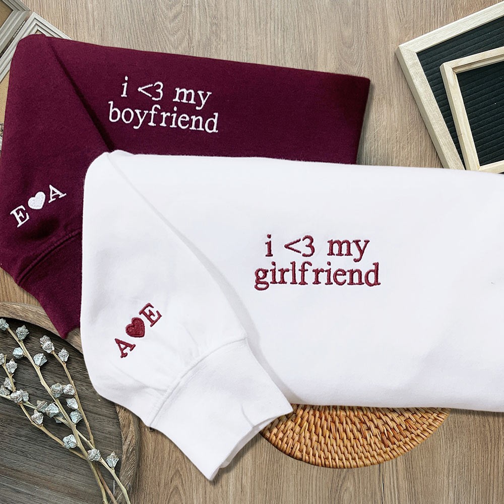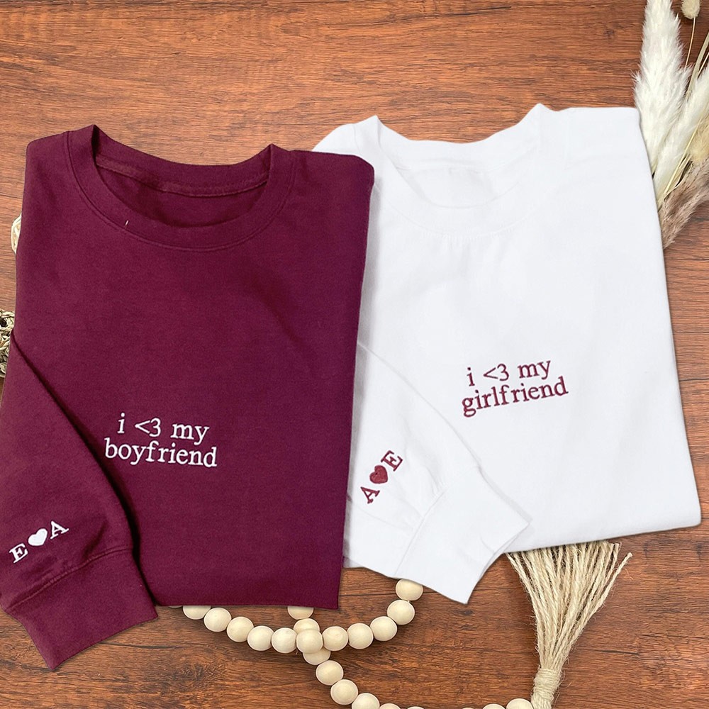 Custom Embroidered I Love My Girlfriend Boyfriend Couple Matching Sweatshirt with Initials on Sleeve Valentine's Day Gifts