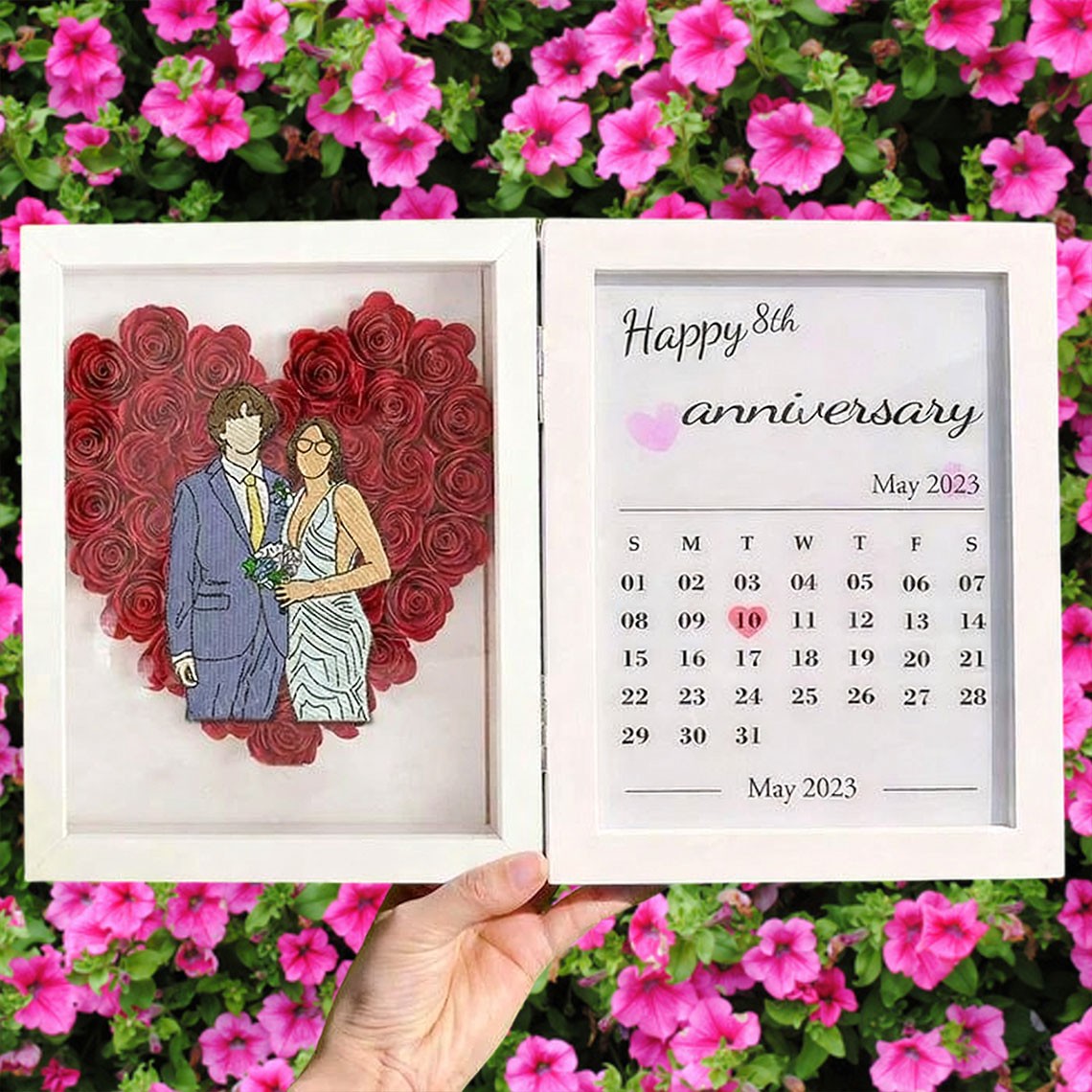 Custom Heart Shape Portrait Flower Shadow Box with Calendar Anniversary Gifts Unique Gifts for Couples