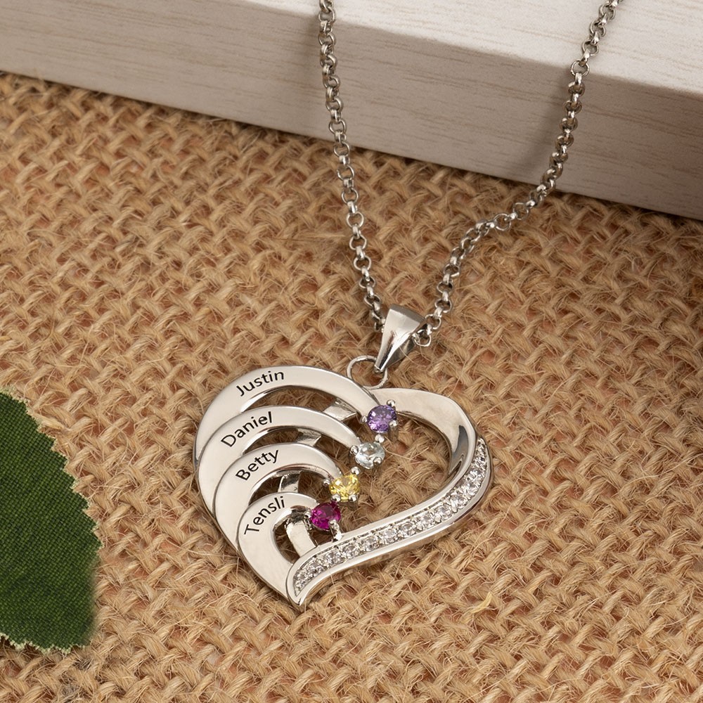 Custom Heart Shaped Birthstones Necklace with 1-6 Names Unique Family Gift For Mom Grandma