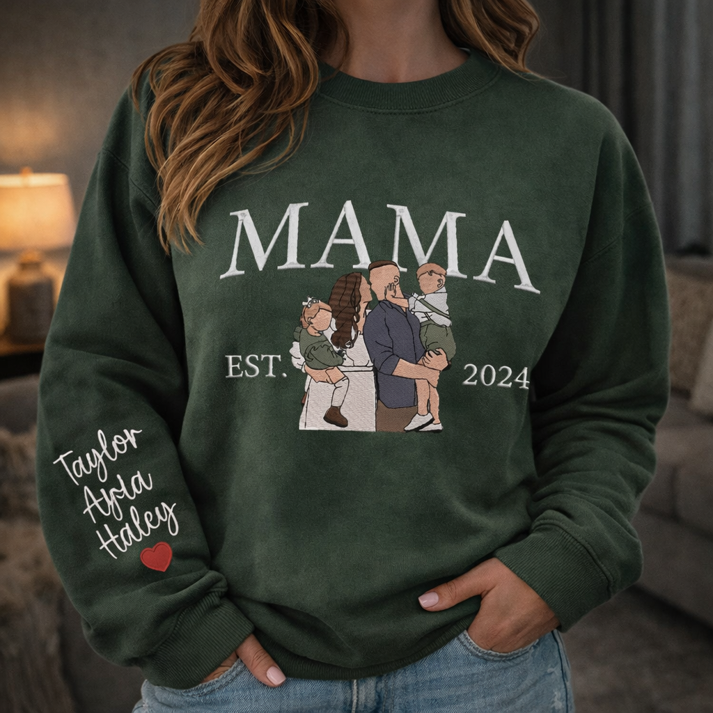 Custom Mama Embroidered Photo Portrait Sweatshirt with Kids Names on Sleeve Gifts for Mom New Mom Gift Mother's Day Gift