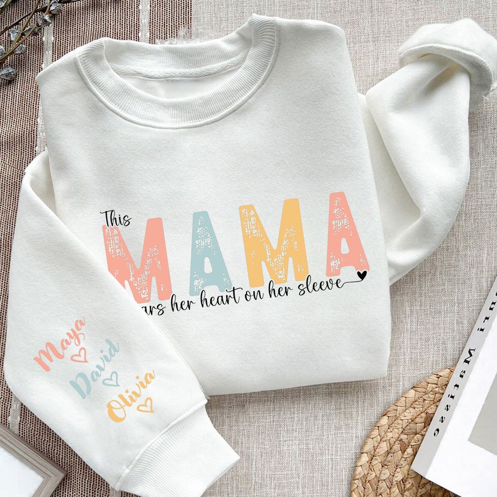 Custom This Mama Wears Her Heart on Her Sleeve Sweatshirt with Kids Names on Sleeve Gifts for Mother's Day New Mom Gift