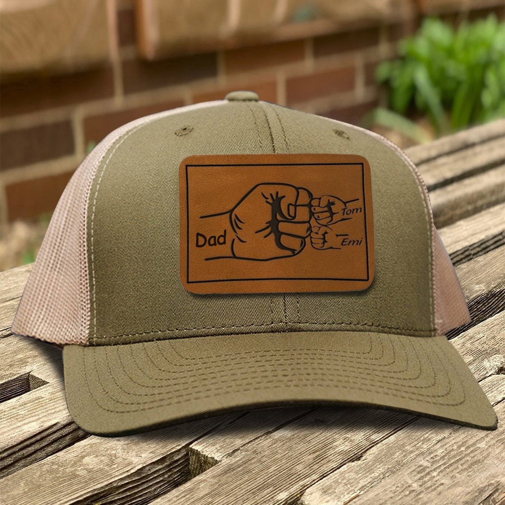 Dad Fist Bump Leather Patch Hat with Kids Names Custom Gifts for Dad Grandpa Father's Day Gift