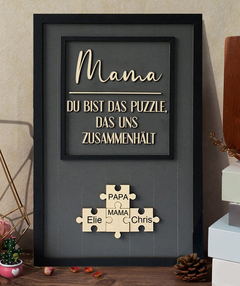 Personalisiertes Holzschild mit der Aufschrift „Mama, du bist das Puzzle, das uns zusammenhält“ mit dem Namen des Kindes, Familiengeschenke für Mama, Oma, einzigartige Geschenkideen zum Muttertag