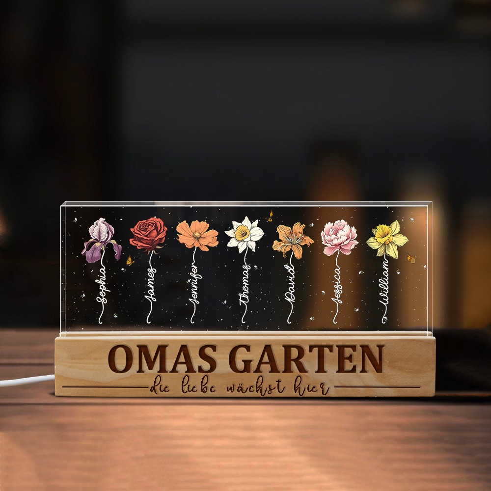 Personalisiertes Geburtsblumen-Nachtlicht aus Holz mit den Namen der Kinder, Mamas Garten, einzigartiges Geburtstagsgeschenk für Mama, Oma, Familienkunstgeschenke, Muttertagsgeschenkideen