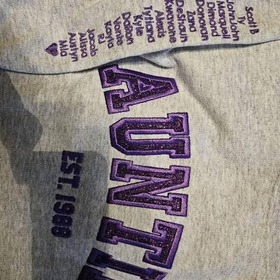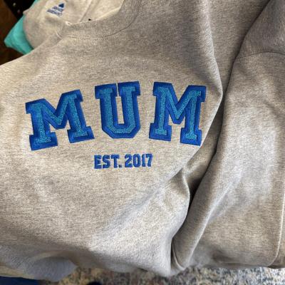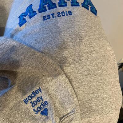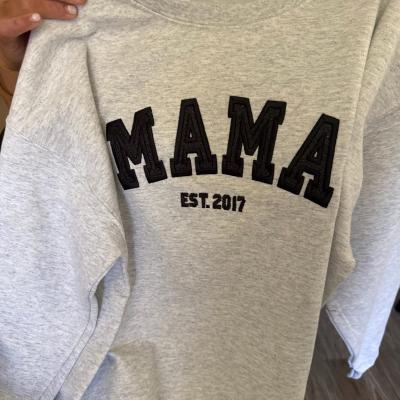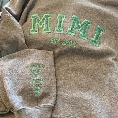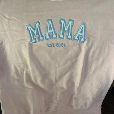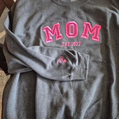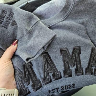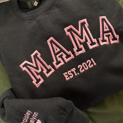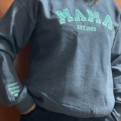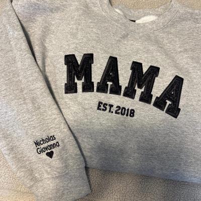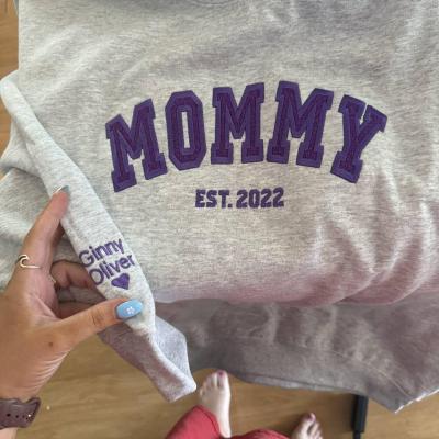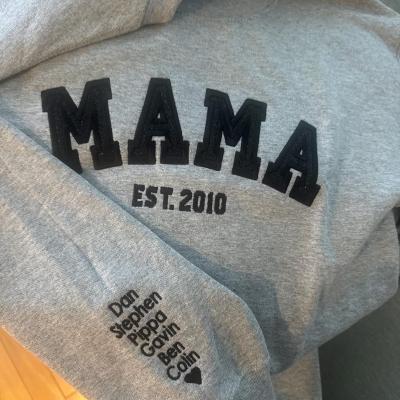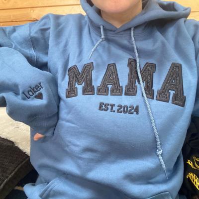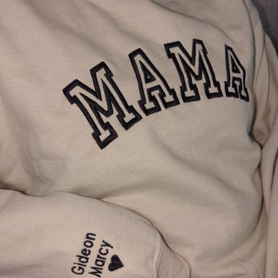 Benutzerdefinierter bestickter Sweatshirt-Hoodie für Mama mit Datum und Kindernamen auf dem Ärmel. Einzigartiges Geburtstagsgeschenk für Mama und Oma. Geschenkideen zum Muttertag. Babyparty-Geschenke.