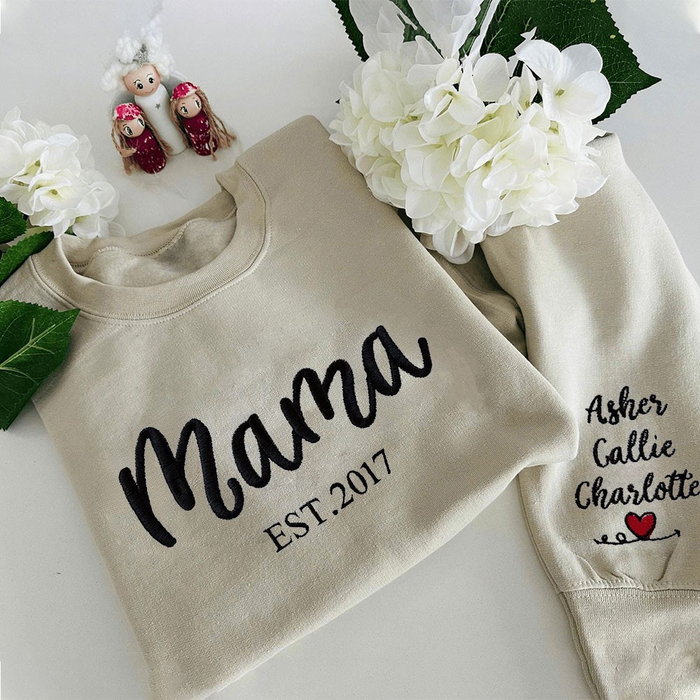 Benutzerdefiniertes Familien-Kapuzenpullover-Sweatshirt mit bestickten Namen der Kinder auf dem Ärmel. Schwangerschaftsgeschenk für Mama. Geburtstagsgeschenk für Mama. Einzigartige Geschenkideen zum Muttertag.