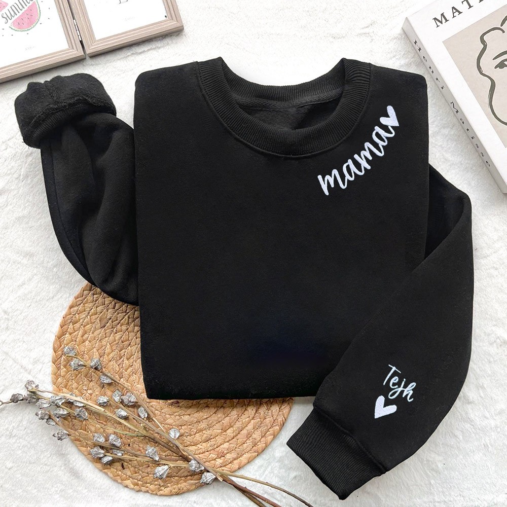 Besticktes Mama-Sweatshirt mit Kindernamen am Ärmel – Personalisiertes Muttertagsgeschenk – Rundhalsausschnitt für neue Mama, Babyparty-Geschenk